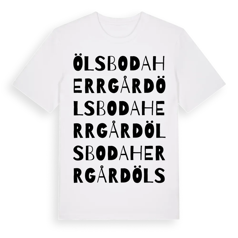 Ölsboda Herrgård ordlek t-shirt är inspirerad av Ölsboda Herrgård i Örebro län, Sverige. Tröjan är designad för dig som har en speciell koppling till platsen – oavsett om du bor här, har rötterna här eller bara älskar Ölsboda Herrgård.