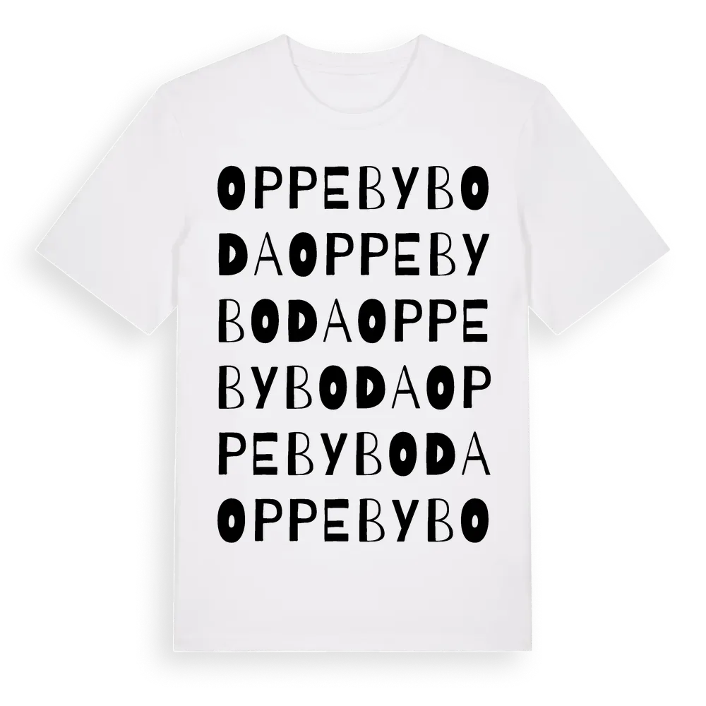 Oppebyboda ordlek t-shirt är inspirerad av Oppebyboda i Örebro län, Sverige. Tröjan är designad för dig som har en speciell koppling till platsen – oavsett om du bor här, har rötterna här eller bara älskar Oppebyboda.
