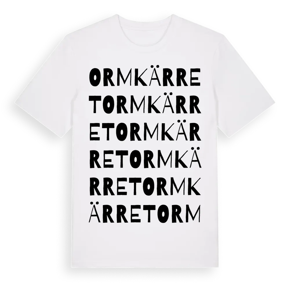 Ormkärret ordlek t-shirt är inspirerad av Ormkärret i Örebro län, Sverige. Tröjan är designad för dig som har en speciell koppling till platsen – oavsett om du bor här, har rötterna här eller bara älskar Ormkärret.