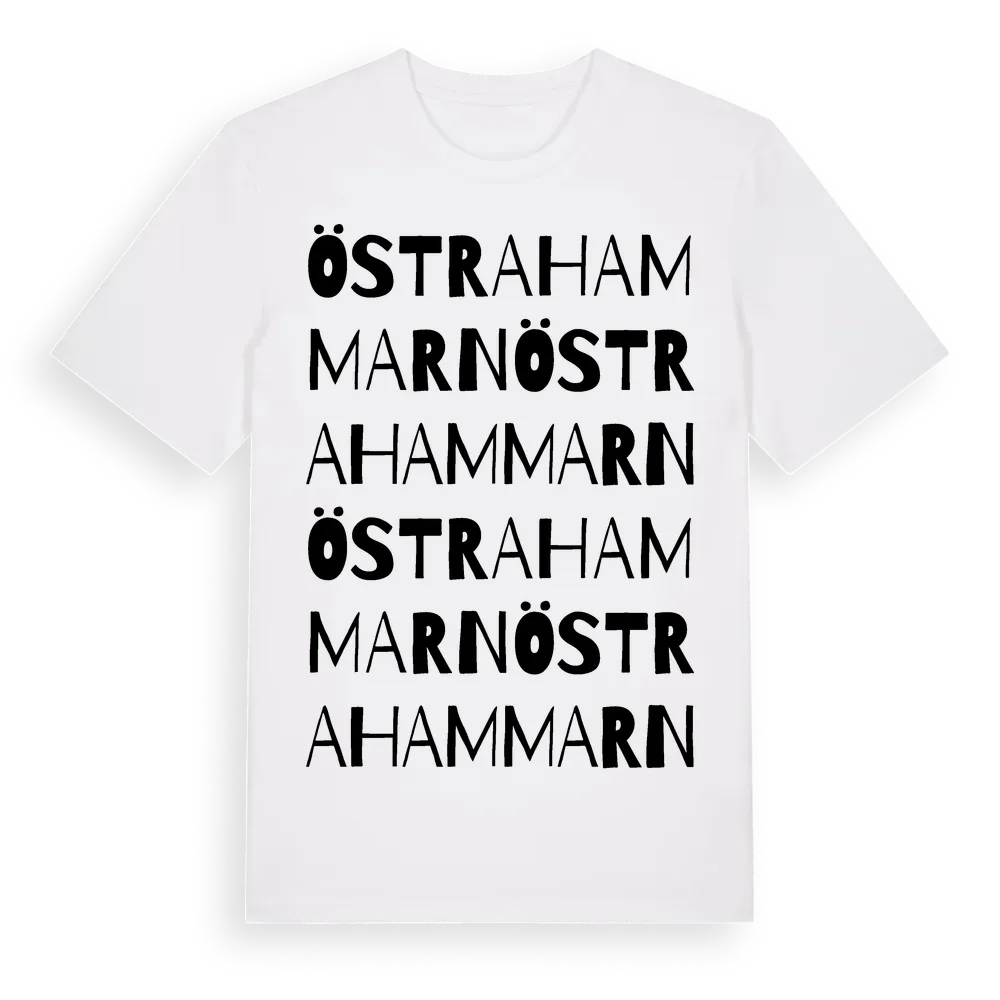 Östra Hammarn ordlek t-shirt är inspirerad av byn Östra Hammarn i Örebro län, Sverige. Tröjan är designad för dig som har en speciell koppling till platsen – oavsett om du bor här, har rötterna här eller bara älskar Östra Hammarn.