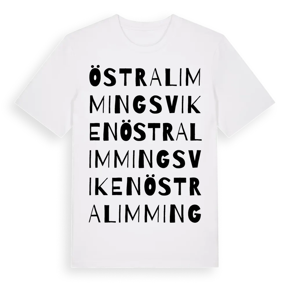 Östra Limmingsviken ordlek t-shirt är inspirerad av Östra Limmingsviken i Örebro län, Sverige. Tröjan är designad för dig som har en speciell koppling till platsen – oavsett om du bor här, har rötterna här eller bara älskar Östra Limmingsviken.