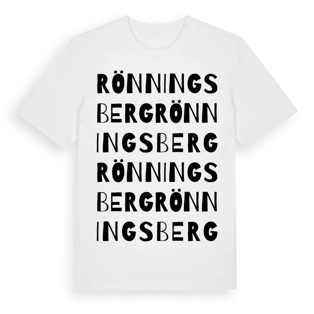 Rönningsberg ordlek t-shirt är inspirerad av Rönningsberg i Örebro län, Sverige. Tröjan är designad för dig som har en speciell koppling till platsen – oavsett om du bor här, har rötterna här eller bara älskar Rönningsberg.