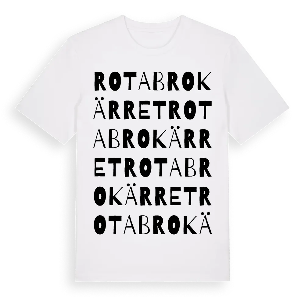 Rotabrokärret ordlek t-shirt är inspirerad av Rotabrokärret i Örebro län, Sverige. Tröjan är designad för dig som har en speciell koppling till platsen – oavsett om du bor här, har rötterna här eller bara älskar Rotabrokärret.