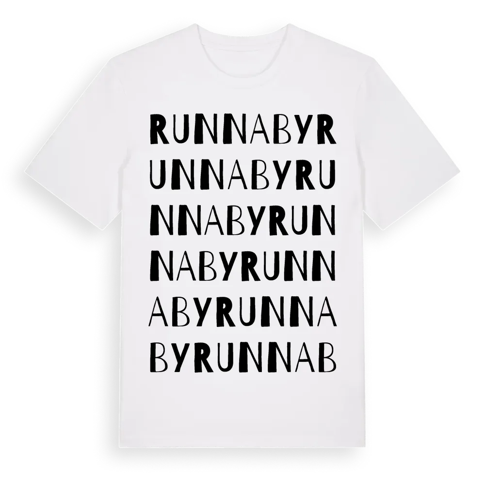 En ordlek byggd på Runnabys namn. Subtilt och klurig – ett motiv som bara de som verkligen känner platsen fullt ut förstår. Premium bomull, unisex – från stadsdelen Runnaby i Örebro län.