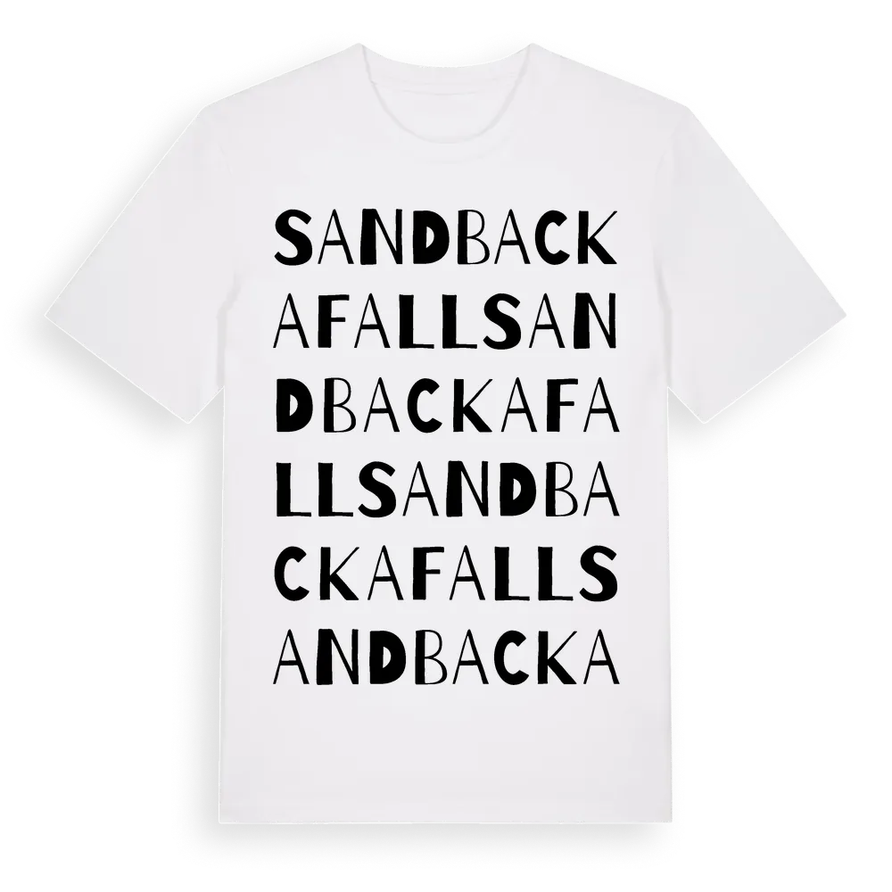 En ordlek byggd på Sandbackafalls namn. Subtilt och klurig – ett motiv som bara de som verkligen känner platsen fullt ut förstår. Premium bomull, unisex – från Sandbackafall i Örebro län.