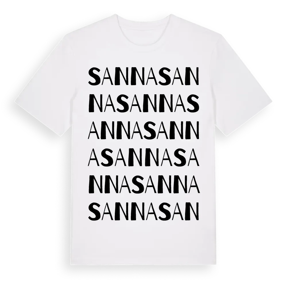 Sanna ordlek t-shirt är inspirerad av Sanna i Örebro län, Sverige. Tröjan är designad för dig som har en speciell koppling till platsen – oavsett om du bor här, har rötterna här eller bara älskar Sanna.