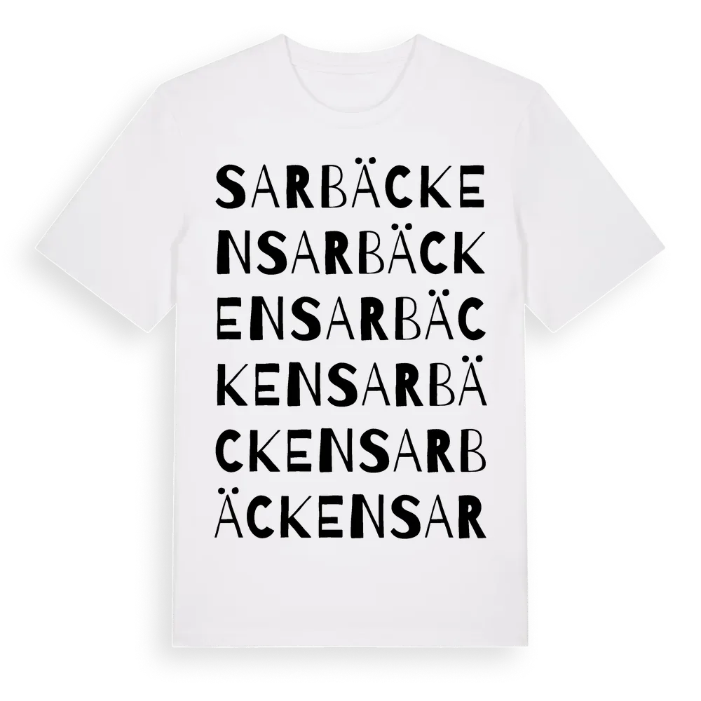Sarbäcken ordlek t-shirt är inspirerad av byn Sarbäcken i Örebro län, Sverige. Tröjan är designad för dig som har en speciell koppling till platsen – oavsett om du bor här, har rötterna här eller bara älskar Sarbäcken.