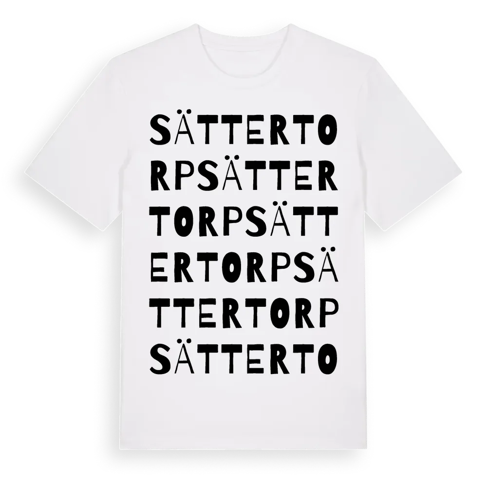 Sättertorp ordlek t-shirt är inspirerad av Sättertorp i Örebro län, Sverige. Tröjan är designad för dig som har en speciell koppling till platsen – oavsett om du bor här, har rötterna här eller bara älskar Sättertorp.