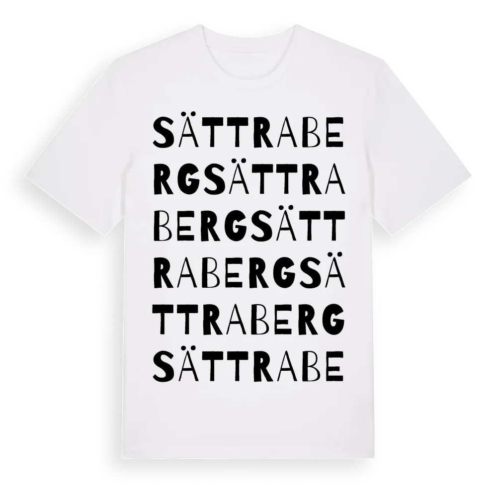 Sättraberg ordlek t-shirt är inspirerad av Sättraberg i Örebro län, Sverige. Tröjan är designad för dig som har en speciell koppling till platsen – oavsett om du bor här, har rötterna här eller bara älskar Sättraberg.