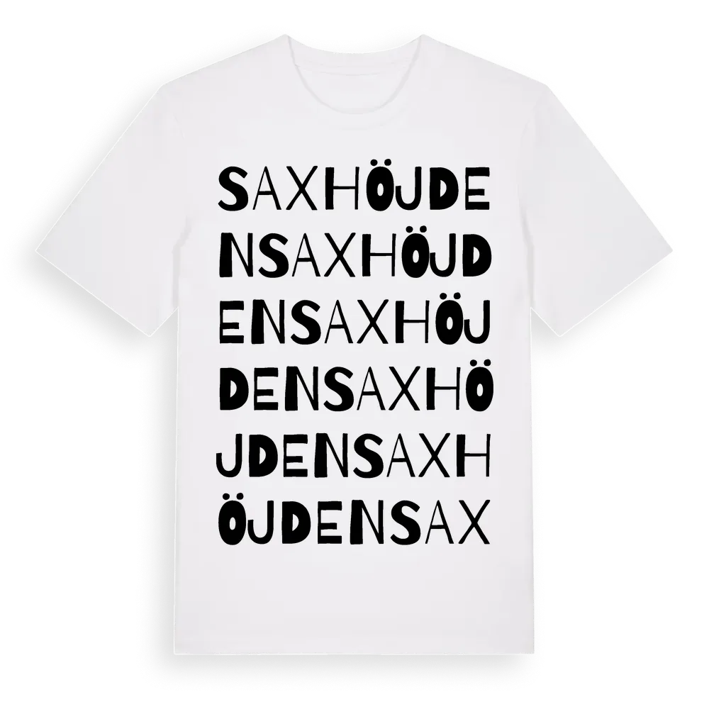 Saxhöjden ordlek t-shirt är inspirerad av Saxhöjden i Örebro län, Sverige. Tröjan är designad för dig som har en speciell koppling till platsen – oavsett om du bor här, har rötterna här eller bara älskar Saxhöjden.