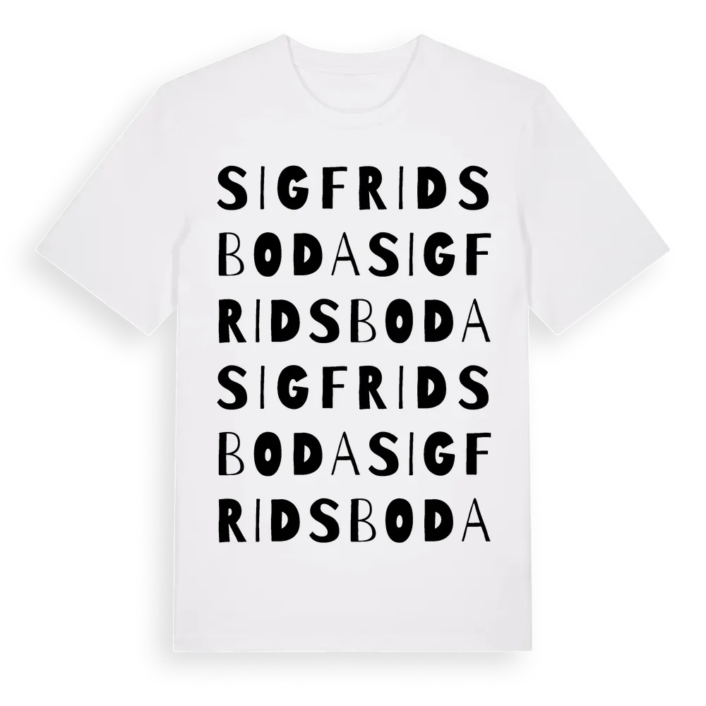 Sigfridsboda ordlek t-shirt är inspirerad av Sigfridsboda i Örebro län, Sverige. Tröjan är designad för dig som har en speciell koppling till platsen – oavsett om du bor här, har rötterna här eller bara älskar Sigfridsboda.