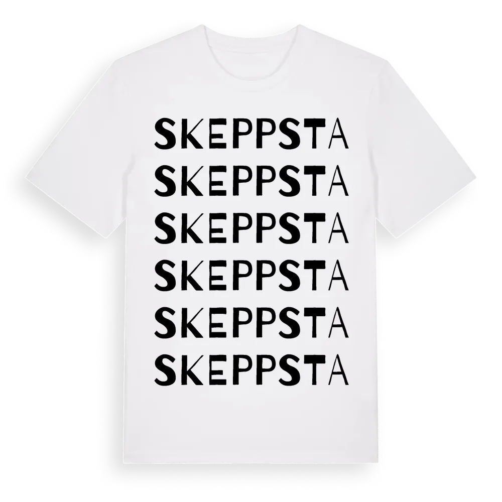 Skeppsta ordlek t-shirt är inspirerad av byn Skeppsta i Örebro län, Sverige. Tröjan är designad för dig som har en speciell koppling till platsen – oavsett om du bor här, har rötterna här eller bara älskar Skeppsta.