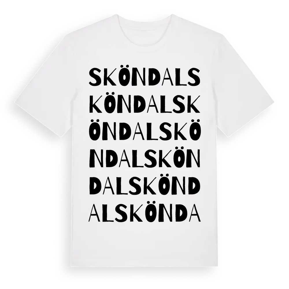 Sköndal ordlek t-shirt är inspirerad av stadsdelen Sköndal i Örebro län, Sverige. Tröjan är designad för dig som har en speciell koppling till platsen – oavsett om du bor här, har rötterna här eller bara älskar Sköndal.