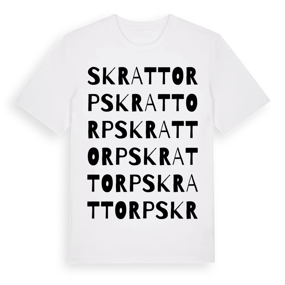 Skrattorp ordlek t-shirt är inspirerad av Skrattorp i Örebro län, Sverige. Tröjan är designad för dig som har en speciell koppling till platsen – oavsett om du bor här, har rötterna här eller bara älskar Skrattorp.