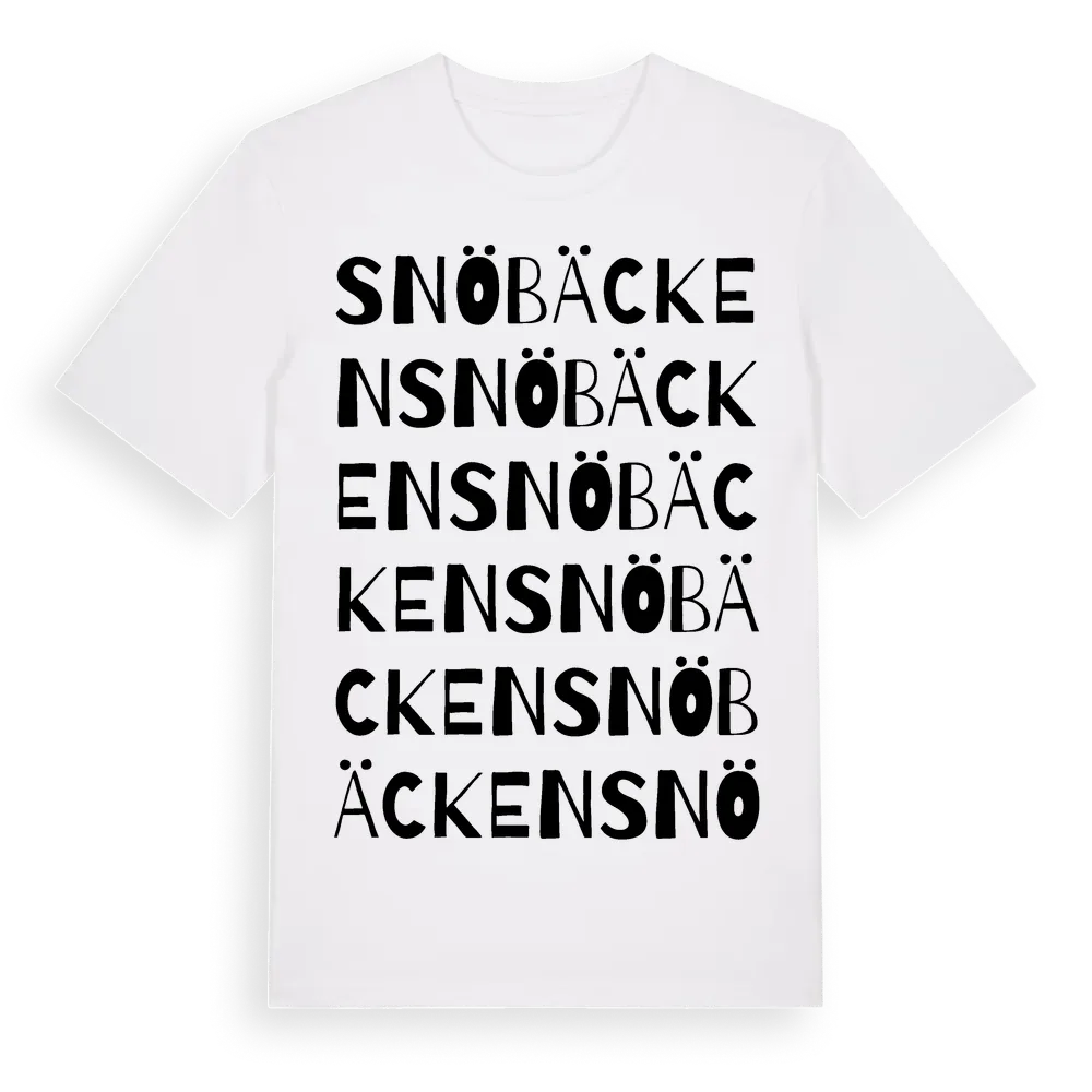 Snöbäcken ordlek t-shirt är inspirerad av Snöbäcken i Örebro län, Sverige. Tröjan är designad för dig som har en speciell koppling till platsen – oavsett om du bor här, har rötterna här eller bara älskar Snöbäcken.