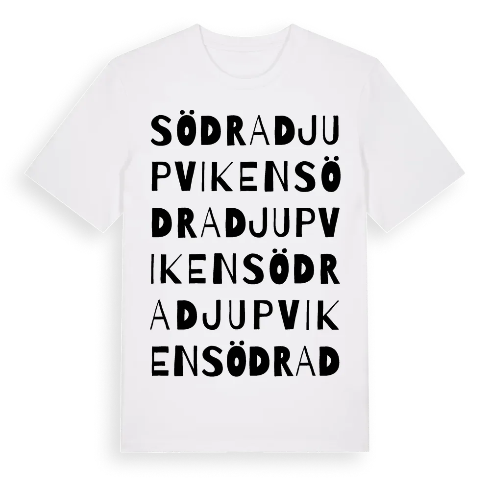Södra Djupviken ordlek t-shirt är inspirerad av Södra Djupviken i Örebro län, Sverige. Tröjan är designad för dig som har en speciell koppling till platsen – oavsett om du bor här, har rötterna här eller bara älskar Södra Djupviken.