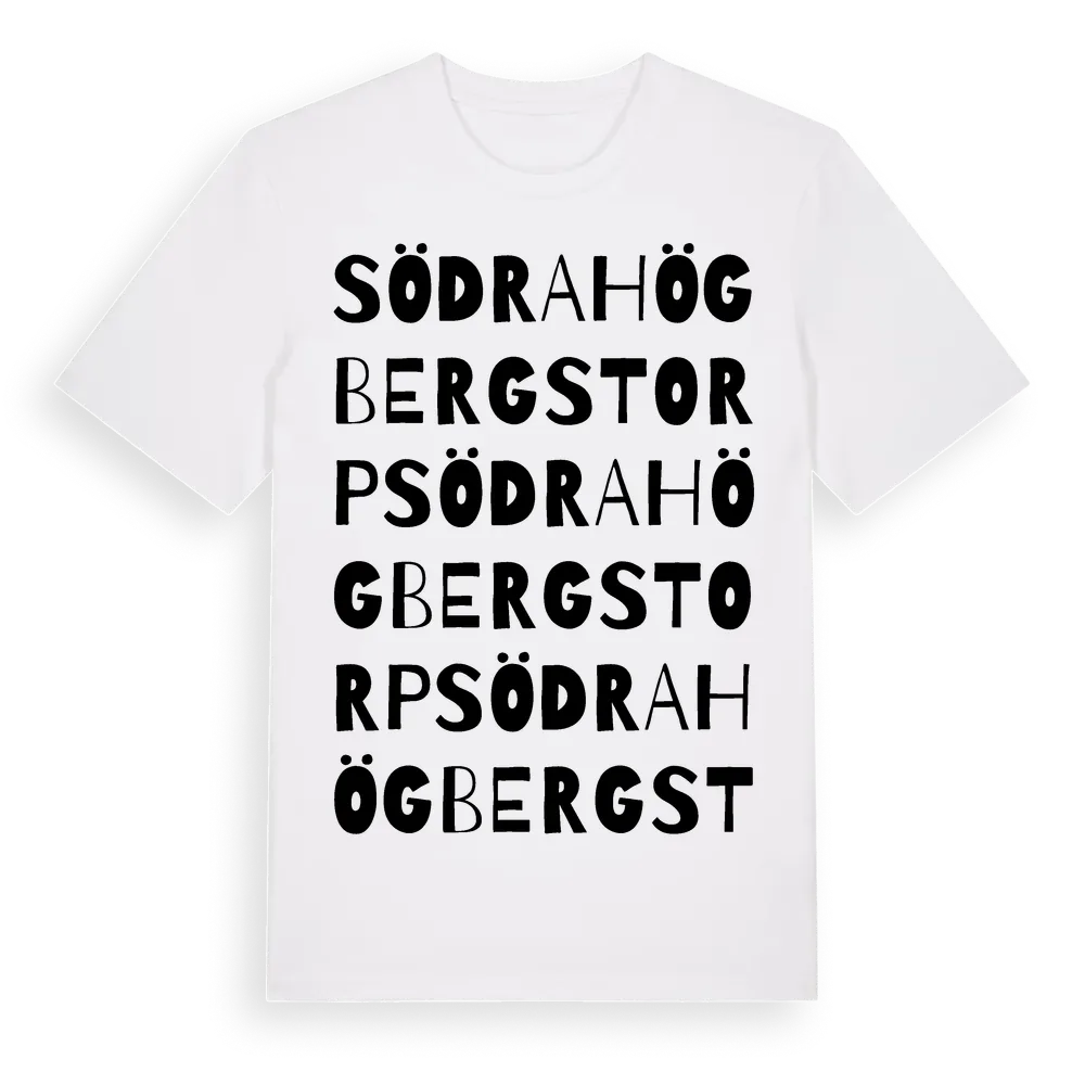 Södra Högbergstorp ordlek t-shirt är inspirerad av Södra Högbergstorp i Örebro län, Sverige. Tröjan är designad för dig som har en speciell koppling till platsen – oavsett om du bor här, har rötterna här eller bara älskar Södra Högbergstorp.