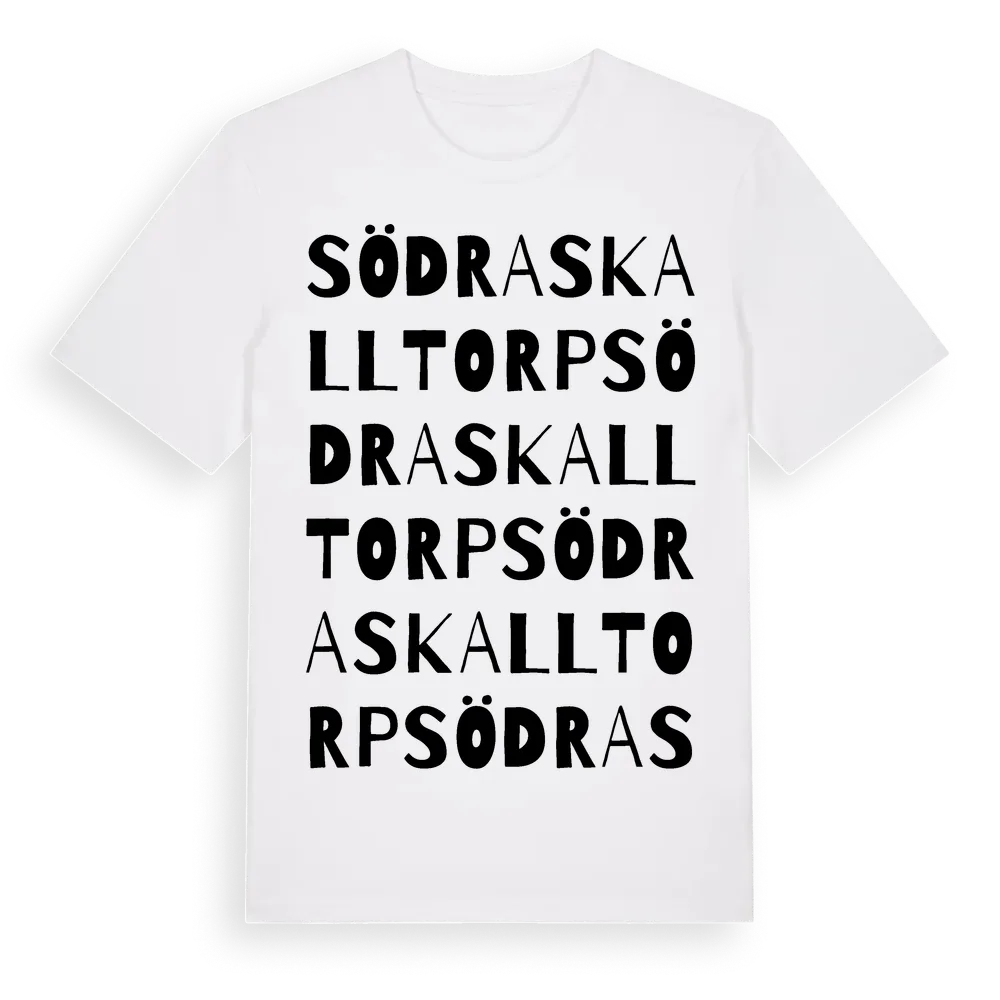 Södra Skalltorp ordlek t-shirt är inspirerad av Södra Skalltorp i Örebro län, Sverige. Tröjan är designad för dig som har en speciell koppling till platsen – oavsett om du bor här, har rötterna här eller bara älskar Södra Skalltorp.