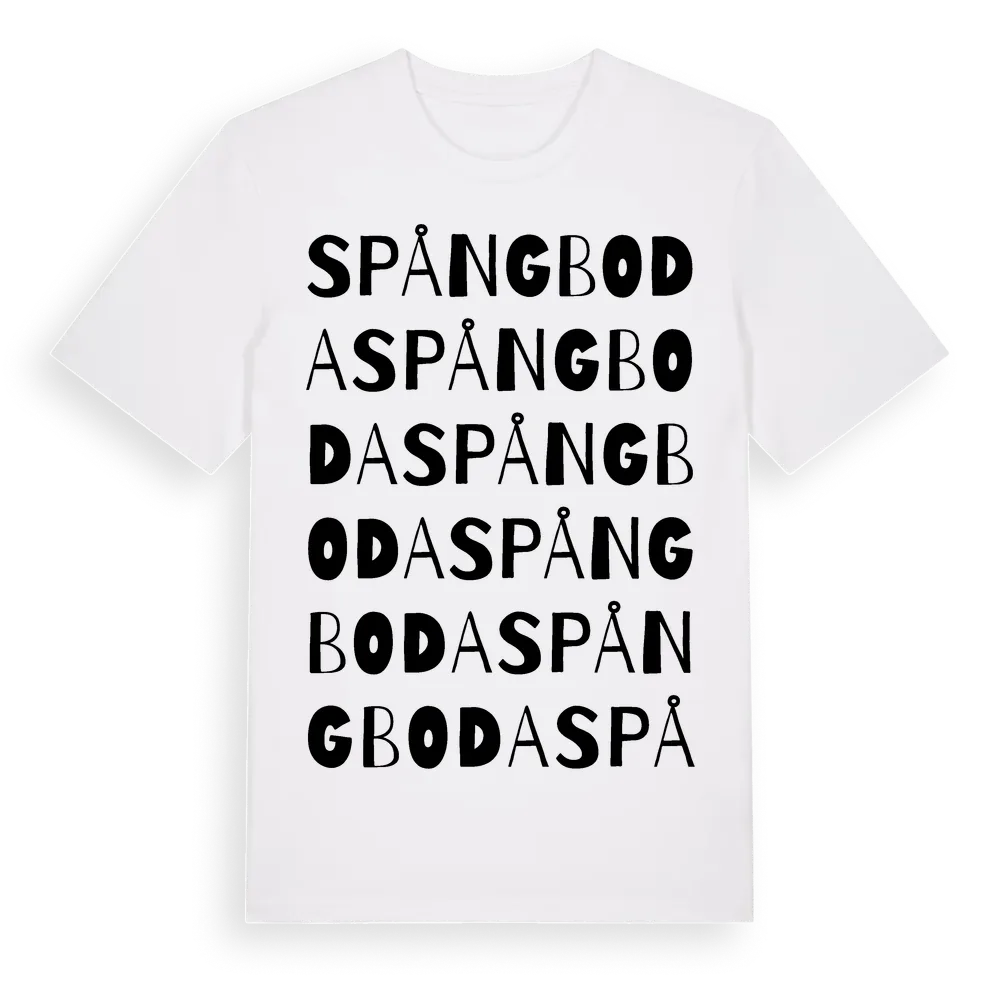 Spångboda ordlek t-shirt är inspirerad av byn Spångboda i Örebro län, Sverige. Tröjan är designad för dig som har en speciell koppling till platsen – oavsett om du bor här, har rötterna här eller bara älskar Spångboda.