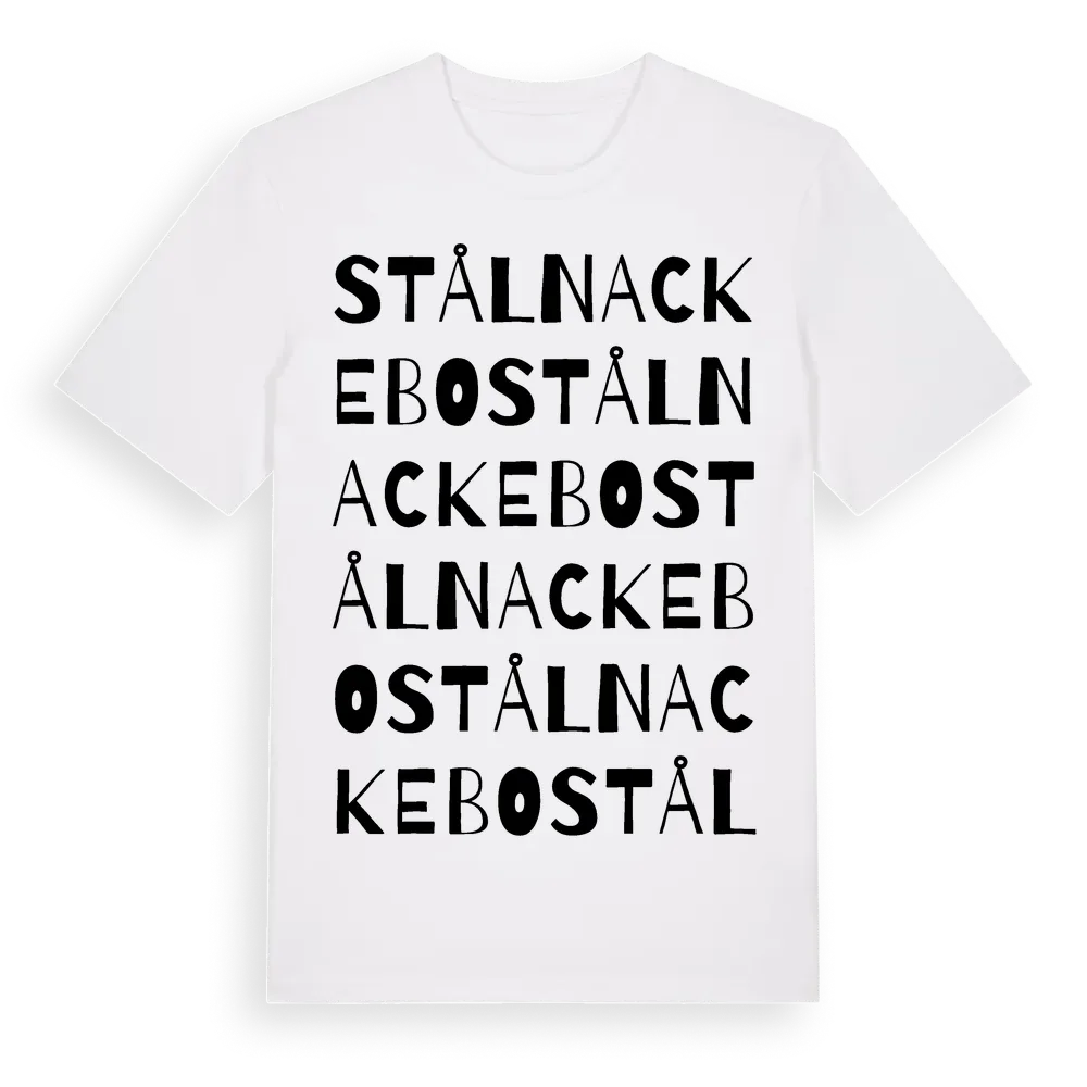 Stålnackebo ordlek t-shirt är inspirerad av stadsdelen Stålnackebo i Örebro län, Sverige. Tröjan är designad för dig som har en speciell koppling till platsen – oavsett om du bor här, har rötterna här eller bara älskar Stålnackebo.