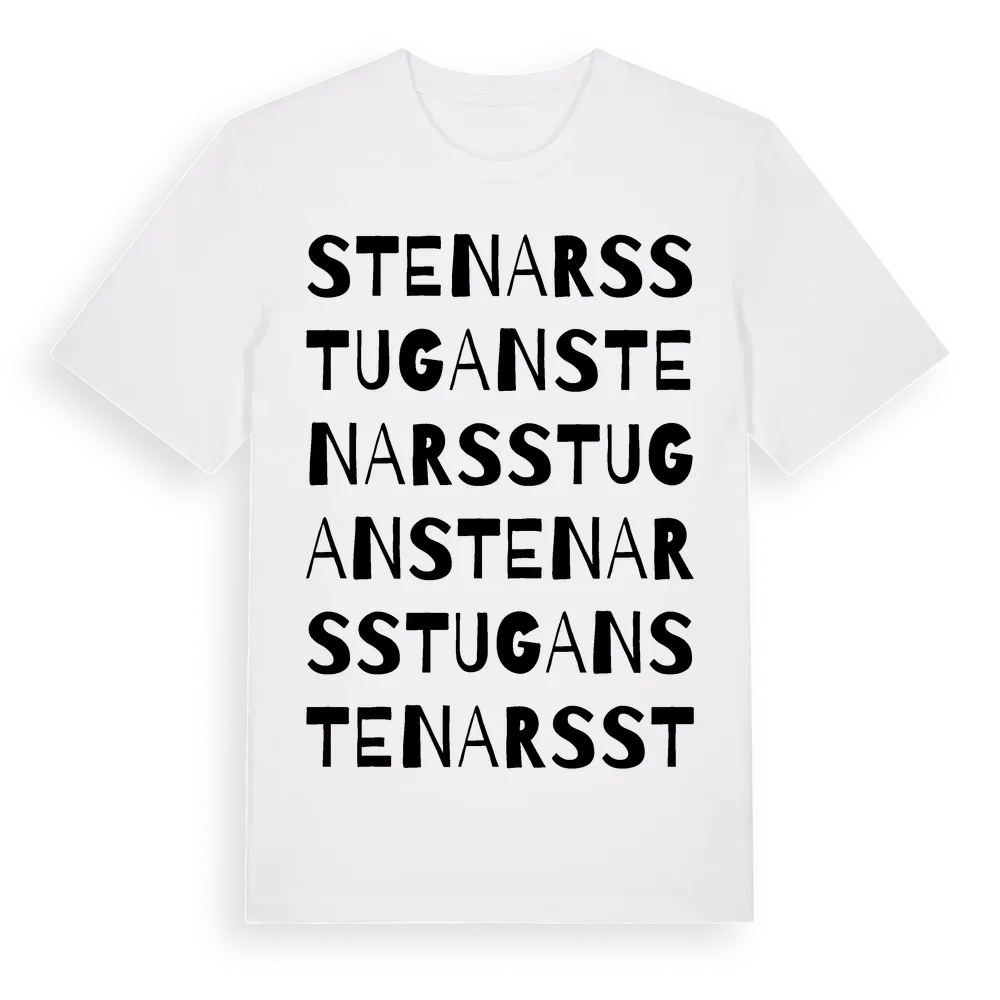 Stenarsstugan ordlek t-shirt är inspirerad av Stenarsstugan i Örebro län, Sverige. Tröjan är designad för dig som har en speciell koppling till platsen – oavsett om du bor här, har rötterna här eller bara älskar Stenarsstugan.