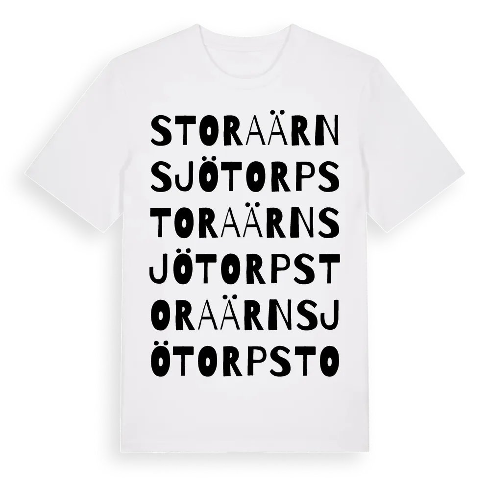 Stora Ärnsjötorp ordlek t-shirt är inspirerad av Stora Ärnsjötorp i Örebro län, Sverige. Tröjan är designad för dig som har en speciell koppling till platsen – oavsett om du bor här, har rötterna här eller bara älskar Stora Ärnsjötorp.