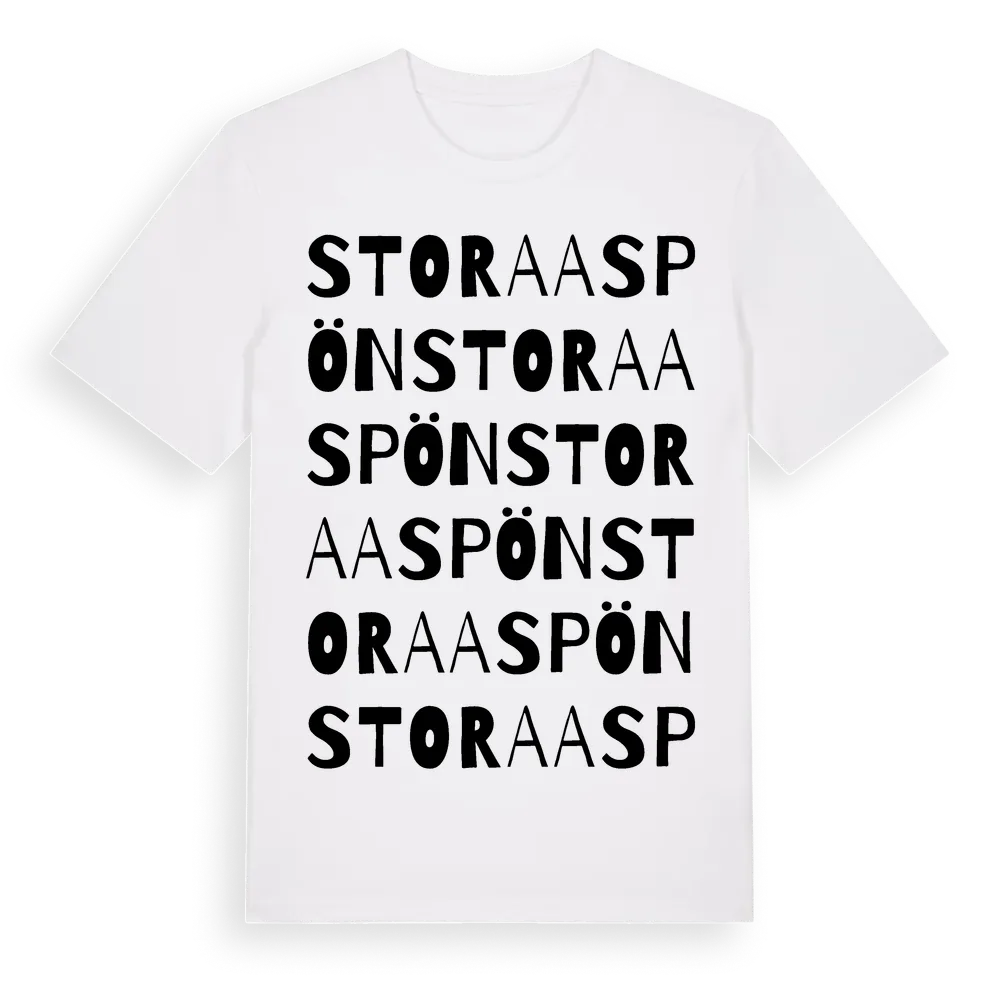 Stora Aspön ordlek t-shirt är inspirerad av ön Stora Aspön i Örebro län, Sverige. Tröjan är designad för dig som har en speciell koppling till platsen – oavsett om du bor här, har rötterna här eller bara älskar Stora Aspön.