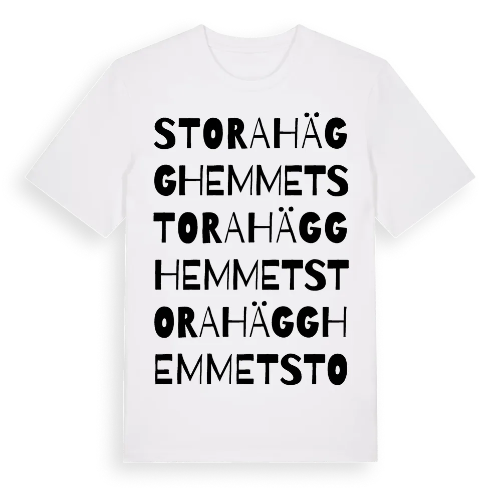 Stora Hägghemmet ordlek t-shirt är inspirerad av Stora Hägghemmet i Örebro län, Sverige. Tröjan är designad för dig som har en speciell koppling till platsen – oavsett om du bor här, har rötterna här eller bara älskar Stora Hägghemmet.