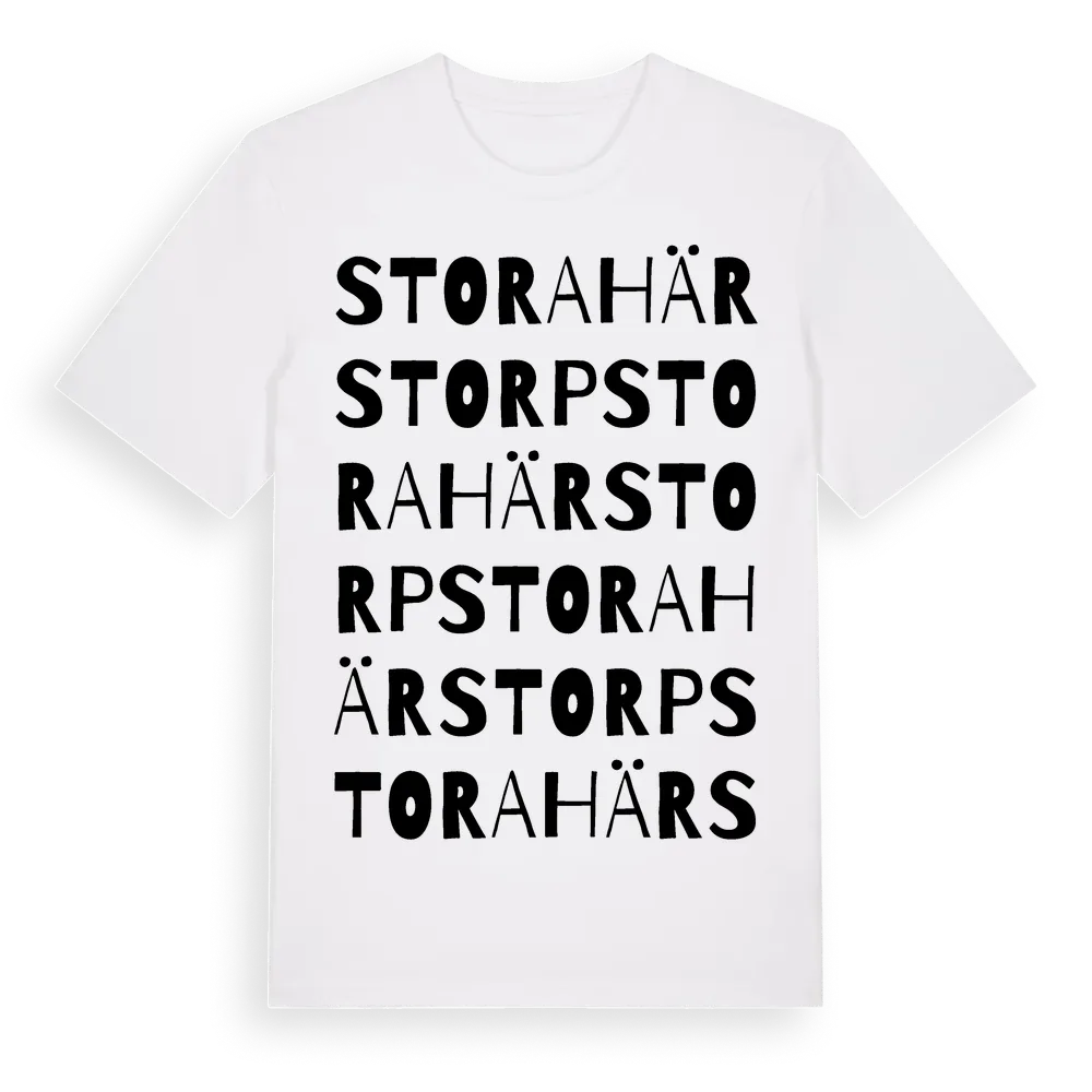 Stora Härstorp ordlek t-shirt är inspirerad av Stora Härstorp i Örebro län, Sverige. Tröjan är designad för dig som har en speciell koppling till platsen – oavsett om du bor här, har rötterna här eller bara älskar Stora Härstorp.