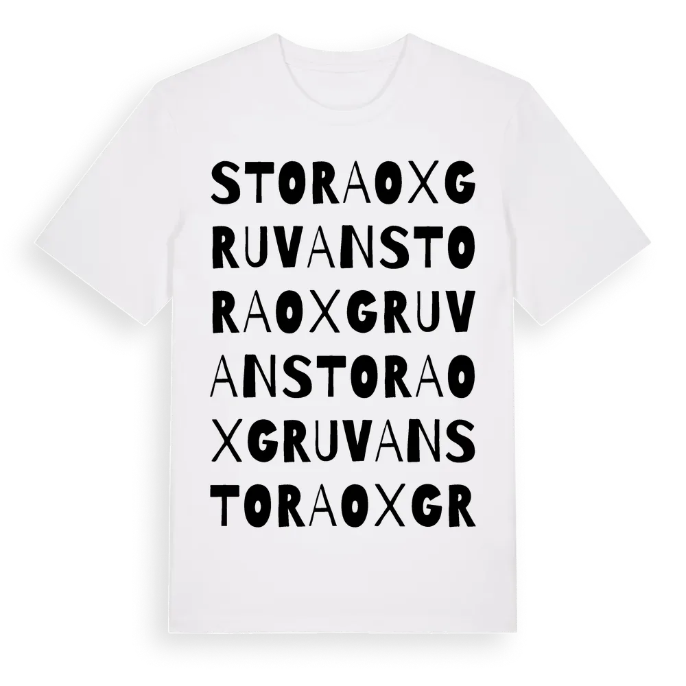 Stora Oxgruvan ordlek t-shirt är inspirerad av Stora Oxgruvan i Örebro län, Sverige. Tröjan är designad för dig som har en speciell koppling till platsen – oavsett om du bor här, har rötterna här eller bara älskar Stora Oxgruvan.