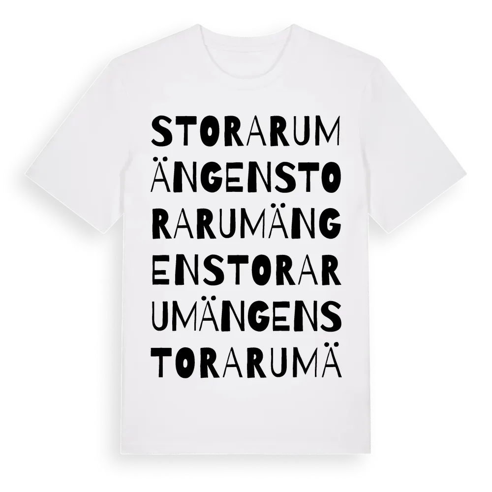 Stora Rumängen ordlek t-shirt är inspirerad av byn Stora Rumängen i Örebro län, Sverige. Tröjan är designad för dig som har en speciell koppling till platsen – oavsett om du bor här, har rötterna här eller bara älskar Stora Rumängen.