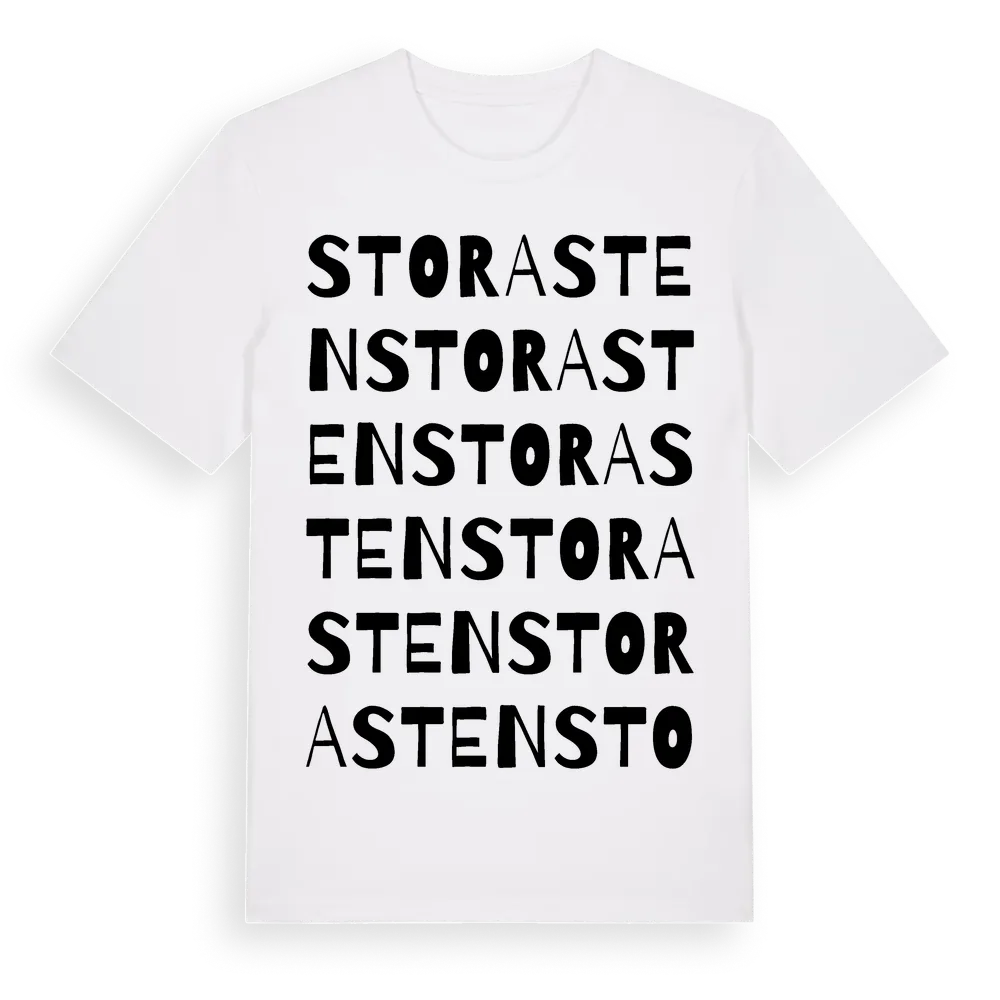 Stora Sten ordlek t-shirt är inspirerad av byn Stora Sten i Örebro län, Sverige. Tröjan är designad för dig som har en speciell koppling till platsen – oavsett om du bor här, har rötterna här eller bara älskar Stora Sten.