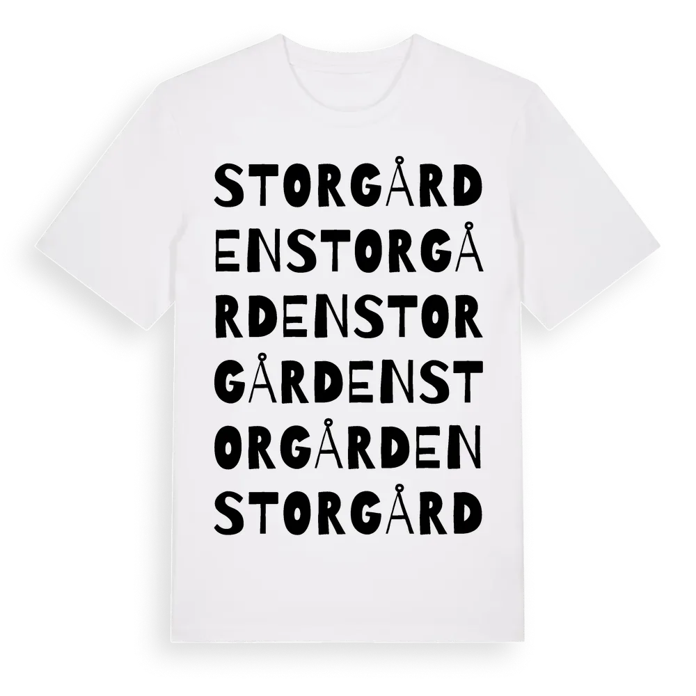 Storgården ordlek t-shirt är inspirerad av Storgården i Örebro län, Sverige. Tröjan är designad för dig som har en speciell koppling till platsen – oavsett om du bor här, har rötterna här eller bara älskar Storgården.