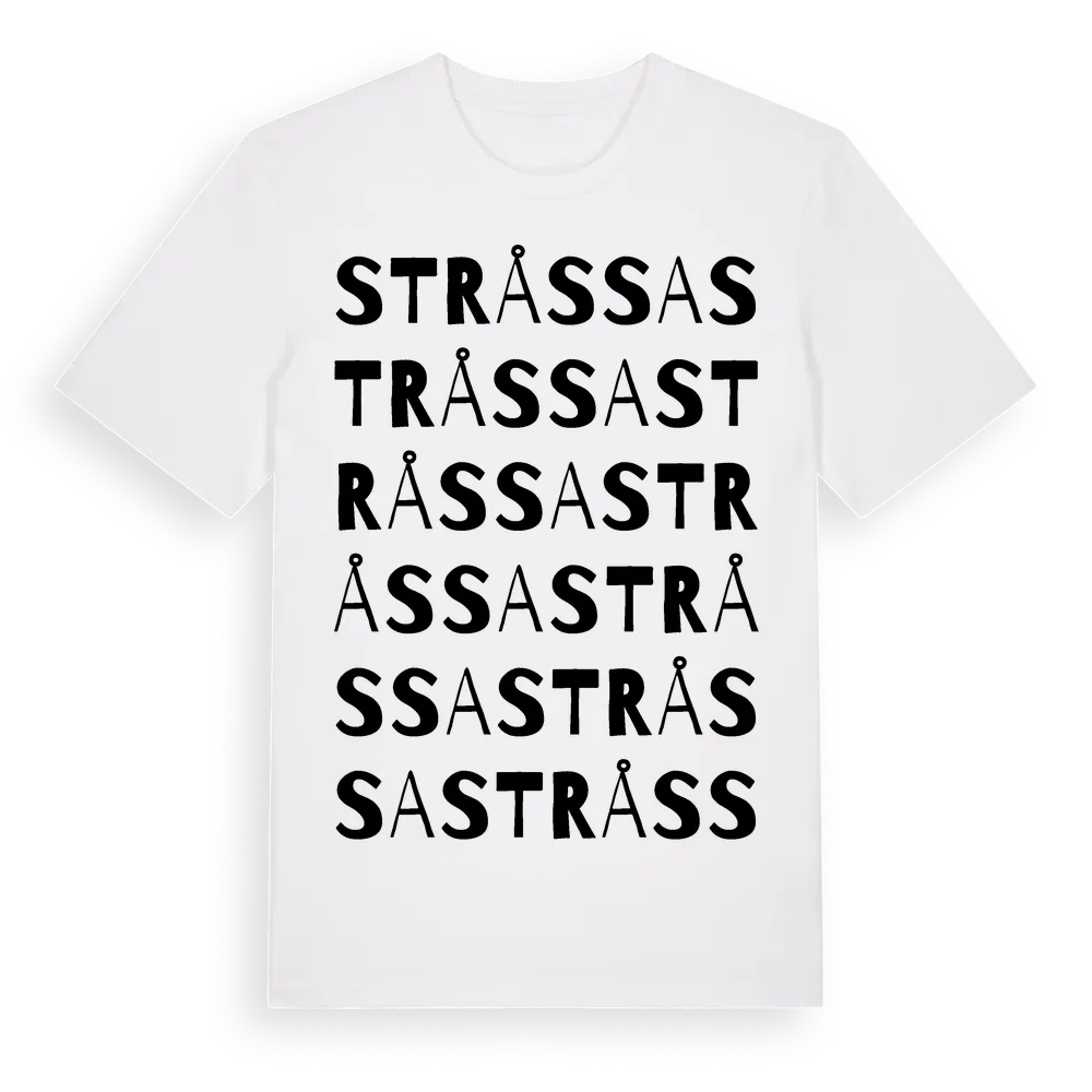 Stråssa ordlek t-shirt är inspirerad av byn Stråssa i Örebro län, Sverige. Tröjan är designad för dig som har en speciell koppling till platsen – oavsett om du bor här, har rötterna här eller bara älskar Stråssa.