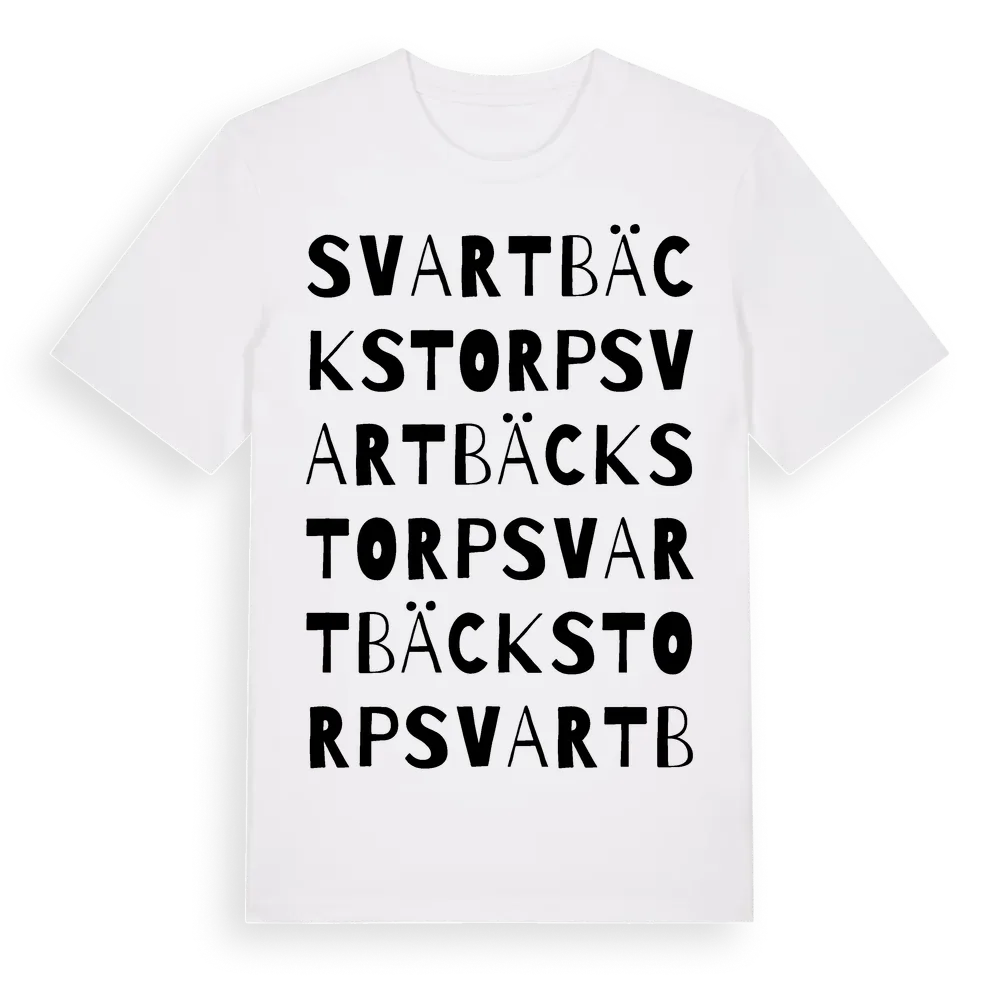 Svartbäckstorp ordlek t-shirt är inspirerad av Svartbäckstorp i Örebro län, Sverige. Tröjan är designad för dig som har en speciell koppling till platsen – oavsett om du bor här, har rötterna här eller bara älskar Svartbäckstorp.