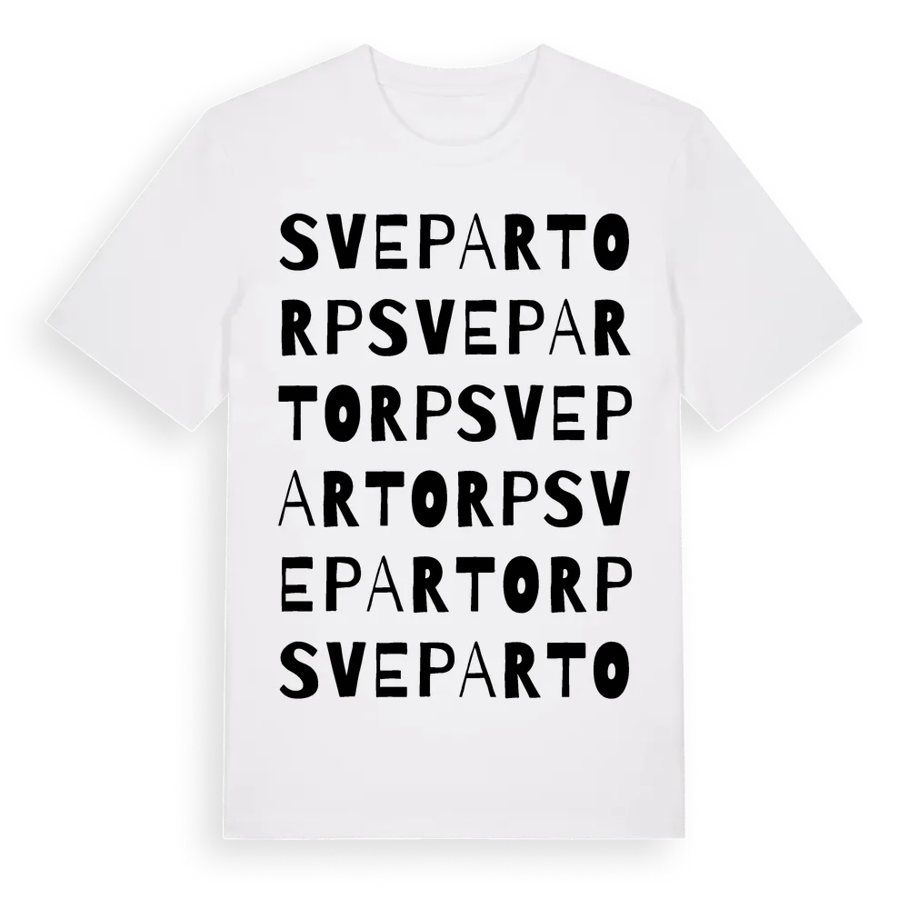 Svepartorp ordlek t-shirt är inspirerad av byn Svepartorp i Örebro län, Sverige. Tröjan är designad för dig som har en speciell koppling till platsen – oavsett om du bor här, har rötterna här eller bara älskar Svepartorp.