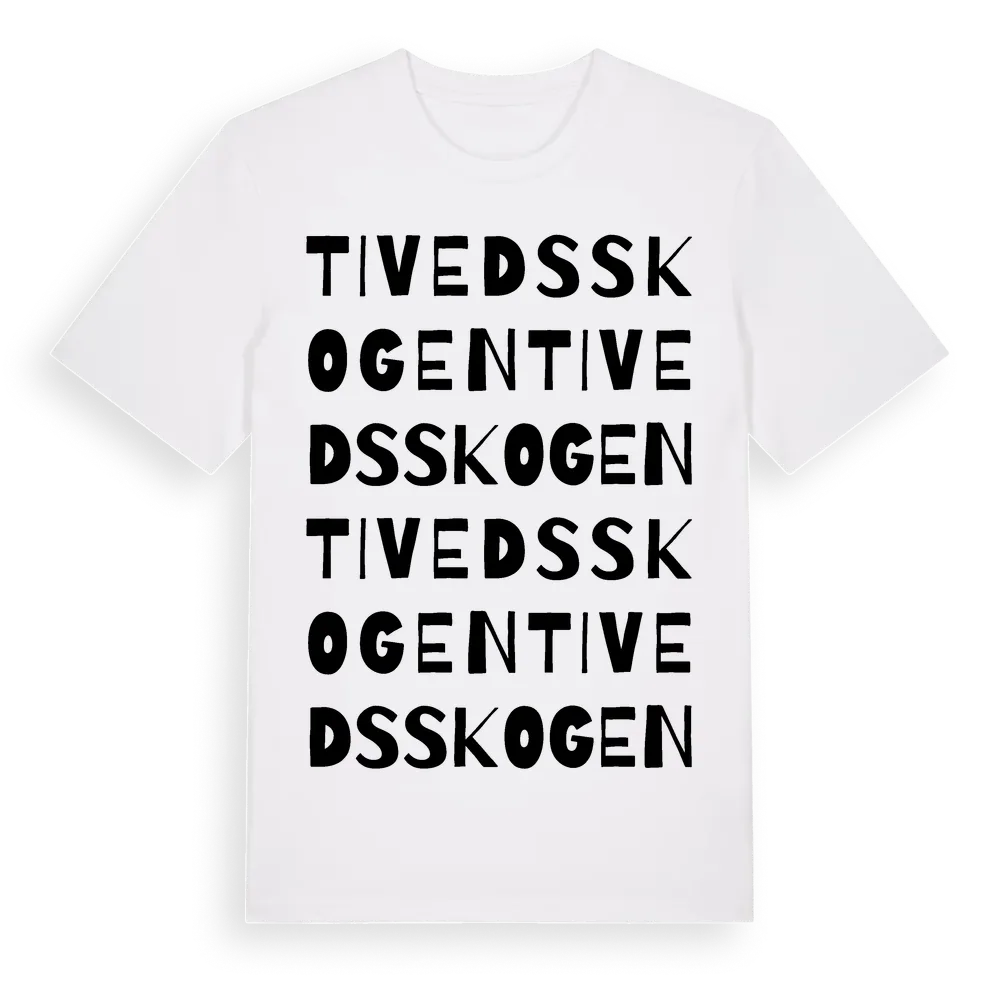 En ordlek byggd på Tivedsskogens namn. Subtilt och klurig – ett motiv som bara de som verkligen känner platsen fullt ut förstår. Premium bomull, unisex – från Tivedsskogen i Örebro län.
