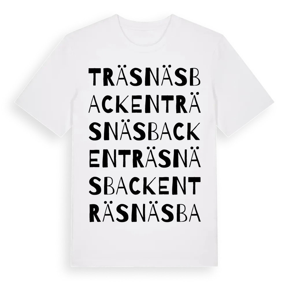 Träsnäsbacken ordlek t-shirt är inspirerad av Träsnäsbacken i Örebro län, Sverige. Tröjan är designad för dig som har en speciell koppling till platsen – oavsett om du bor här, har rötterna här eller bara älskar Träsnäsbacken.