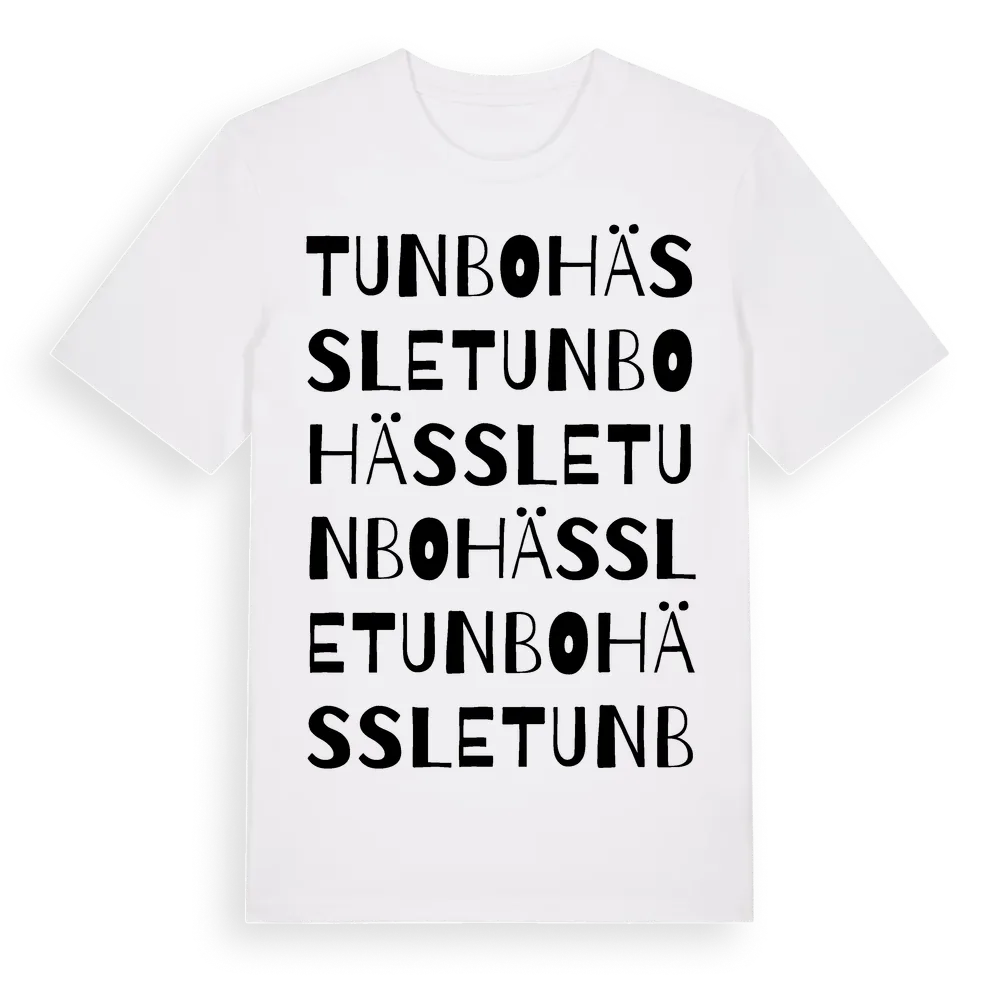Tunbohässle ordlek t-shirt är inspirerad av byn Tunbohässle i Örebro län, Sverige. Tröjan är designad för dig som har en speciell koppling till platsen – oavsett om du bor här, har rötterna här eller bara älskar Tunbohässle.