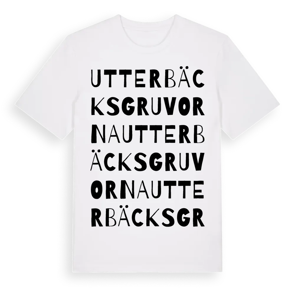 Utterbäcksgruvorna ordlek t-shirt är inspirerad av Utterbäcksgruvorna i Örebro län, Sverige. Tröjan är designad för dig som har en speciell koppling till platsen – oavsett om du bor här, har rötterna här eller bara älskar Utterbäcksgruvorna.