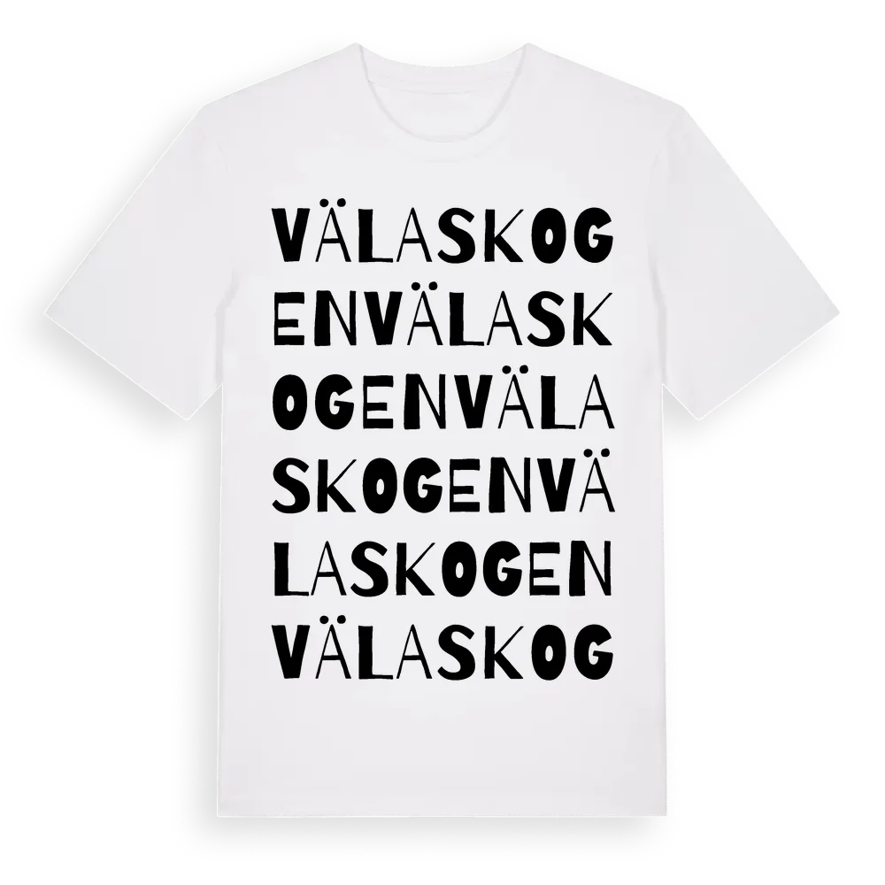 Välaskogen ordlek t-shirt är inspirerad av Välaskogen i Örebro län, Sverige. Tröjan är designad för dig som har en speciell koppling till platsen – oavsett om du bor här, har rötterna här eller bara älskar Välaskogen.