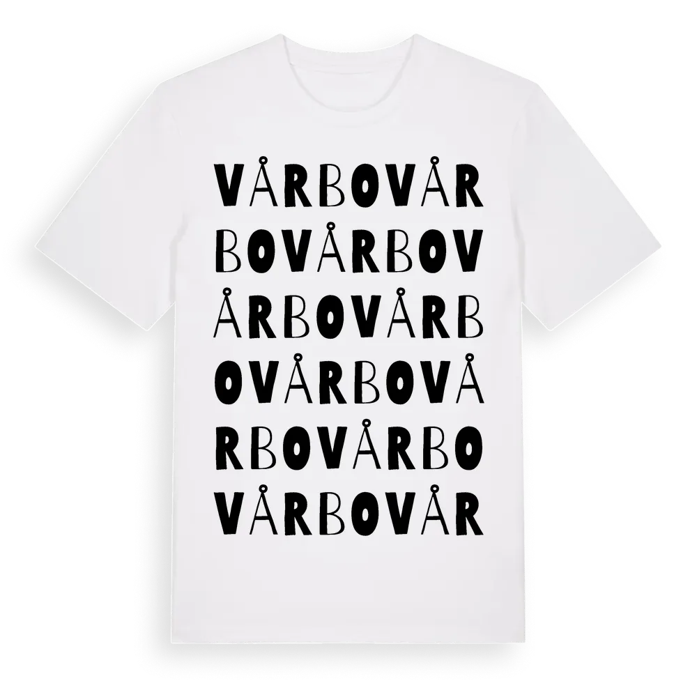 Vårbo ordlek t-shirt är inspirerad av byn Vårbo i Örebro län, Sverige. Tröjan är designad för dig som har en speciell koppling till platsen – oavsett om du bor här, har rötterna här eller bara älskar Vårbo.
