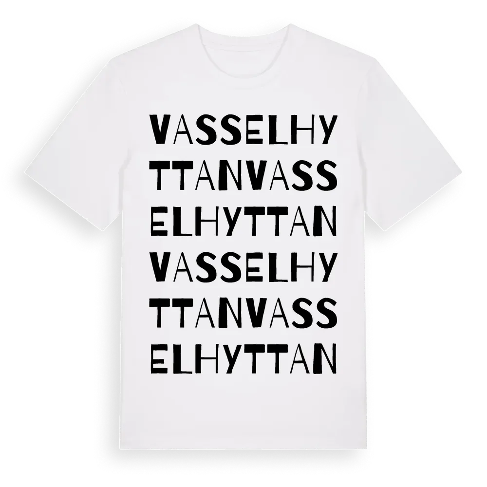 Vasselhyttan ordlek t-shirt är inspirerad av byn Vasselhyttan i Örebro län, Sverige. Tröjan är designad för dig som har en speciell koppling till platsen – oavsett om du bor här, har rötterna här eller bara älskar Vasselhyttan.