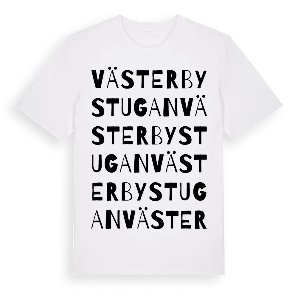 Västerbystugan ordlek t-shirt är inspirerad av Västerbystugan i Örebro län, Sverige. Tröjan är designad för dig som har en speciell koppling till platsen – oavsett om du bor här, har rötterna här eller bara älskar Västerbystugan.