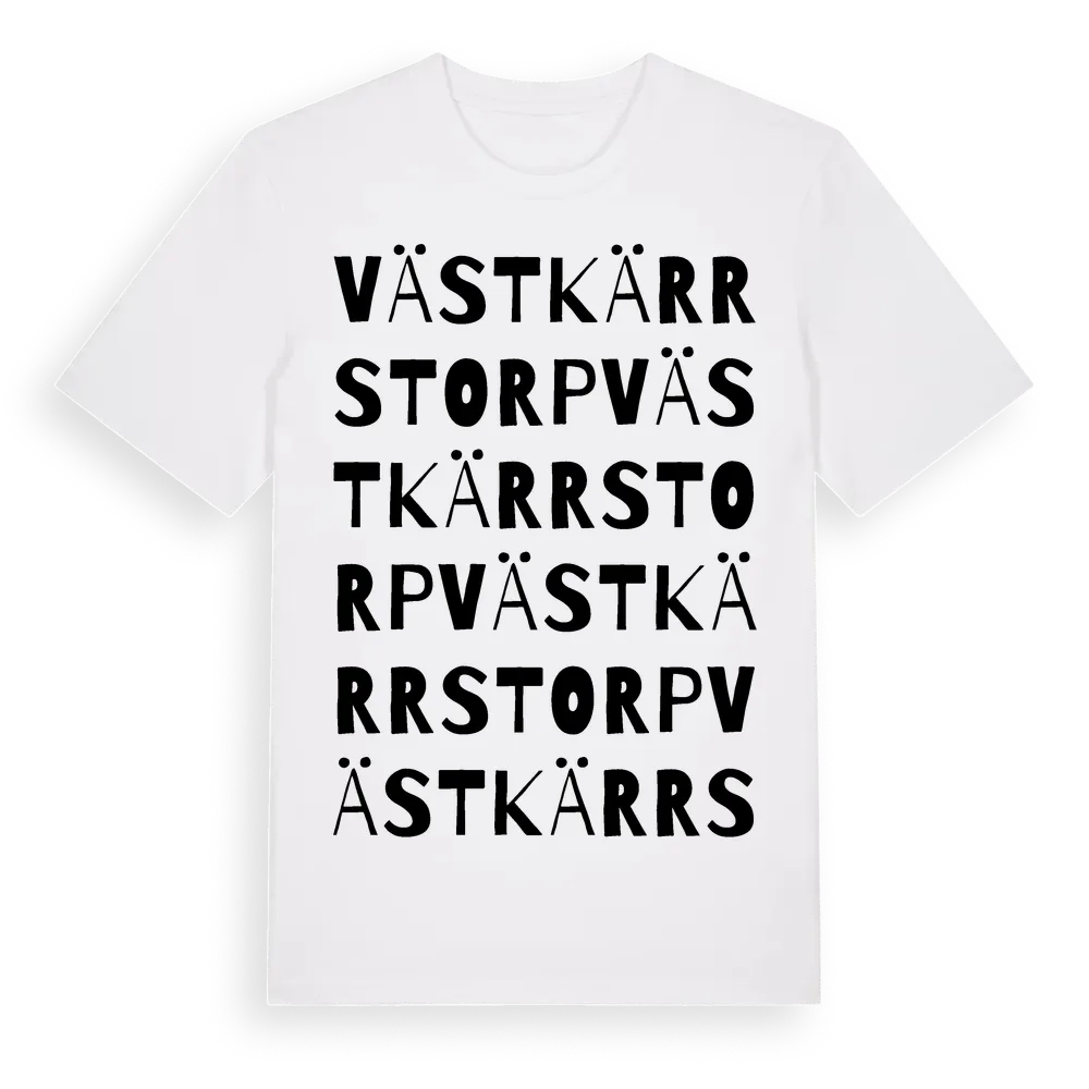 Västkärrstorp ordlek t-shirt är inspirerad av Västkärrstorp i Örebro län, Sverige. Tröjan är designad för dig som har en speciell koppling till platsen – oavsett om du bor här, har rötterna här eller bara älskar Västkärrstorp.