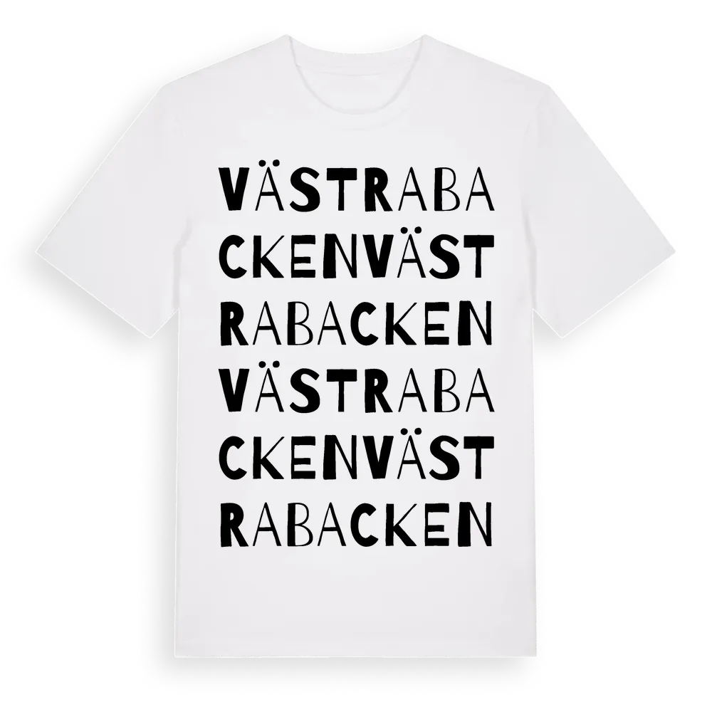 Västra Backen ordlek t-shirt är inspirerad av byn Västra Backen i Örebro län, Sverige. Tröjan är designad för dig som har en speciell koppling till platsen – oavsett om du bor här, har rötterna här eller bara älskar Västra Backen.
