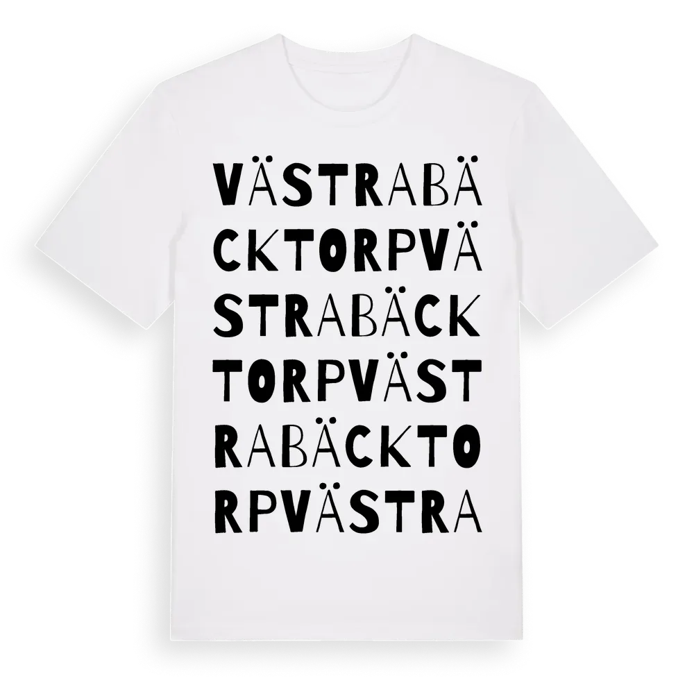 Västra Bäcktorp ordlek t-shirt är inspirerad av Västra Bäcktorp i Örebro län, Sverige. Tröjan är designad för dig som har en speciell koppling till platsen – oavsett om du bor här, har rötterna här eller bara älskar Västra Bäcktorp.