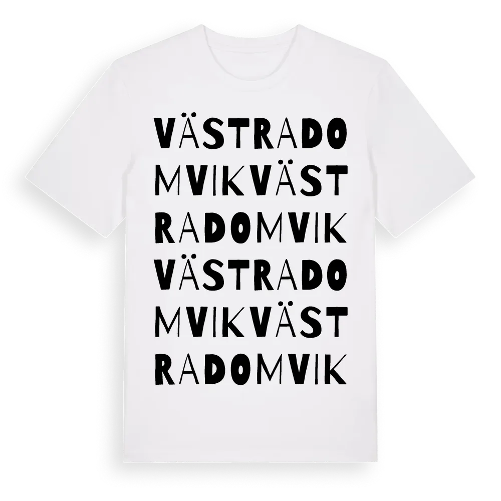 Västra Domvik ordlek t-shirt är inspirerad av Västra Domvik i Örebro län, Sverige. Tröjan är designad för dig som har en speciell koppling till platsen – oavsett om du bor här, har rötterna här eller bara älskar Västra Domvik.