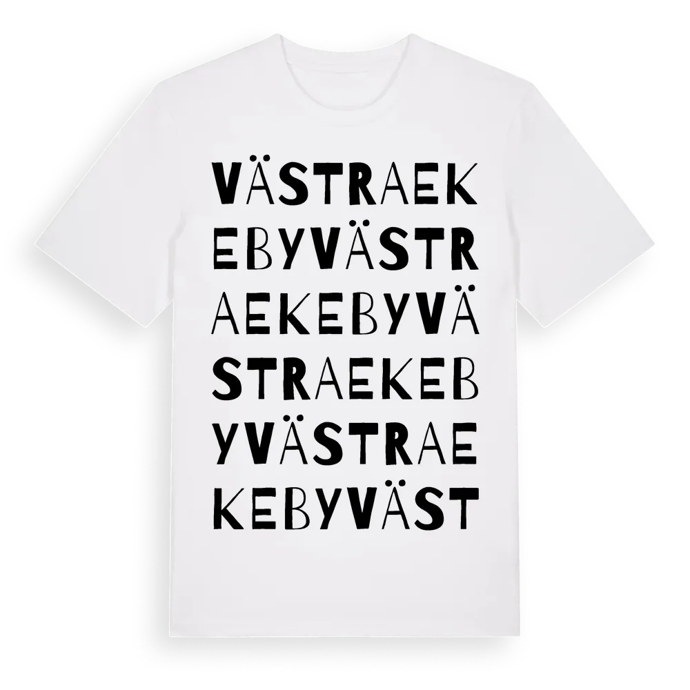Västra Ekeby ordlek t-shirt är inspirerad av byn Västra Ekeby i Örebro län, Sverige. Tröjan är designad för dig som har en speciell koppling till platsen – oavsett om du bor här, har rötterna här eller bara älskar Västra Ekeby.