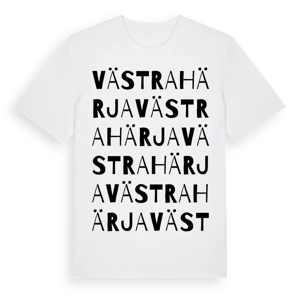 Västra Härja ordlek t-shirt är inspirerad av Västra Härja i Örebro län, Sverige. Tröjan är designad för dig som har en speciell koppling till platsen – oavsett om du bor här, har rötterna här eller bara älskar Västra Härja.